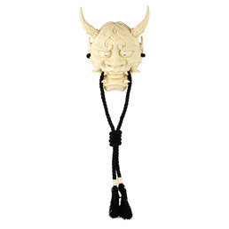 Маска выполнена из высококачественного двухкомпонентного полиуретанового пластика, безопасного для кожи и подходящего для ношения. Детально проработанные рога, острые клыки, глубокие глазные отверстия и изящные рельефные завитки подчёркивают мистический и драматичный характер образа. Чёрные шнуры с кистями добавляют аутентичности и отсылают к классическим театральным аксессуарам.